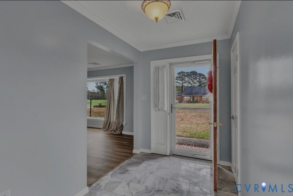 A Masterfully Renovated Oasis on 2.12 Acres Discover the perfect blend of modern luxury and timeless elegance at 9828 Line Fence Rd. in Hayes, Virginia. This beautifully renovated 3-bedroom, 2-bathroom home is nestled on a sprawling 2.12-acre lot, offering a private and serene retreat. From the moment you step through the marble entryway you'll be captivated by the meticulous attention to detail and high-end finishes that define this exceptional property. The heart of this home is the stunning kitchen, beautifully remodeled in 2008 by Home Depot. It features gorgeous KraftMaid cabinetry with slow-closing drawers, sleek stainless steel appliances, and durable quartz countertops. A large island with built-in storage provides the perfect centerpiece for casual dining or meal preparation. The kitchen flows seamlessly into a formal dining room, which boasts custom built-in seating with convenient storage drawers beneath. The spacious living room is bathed in natural light from a beautiful bay window, creating a warm and inviting atmosphere. For a more relaxed setting, the den offers a cozy brick fireplace and a built-in bookcase. The master suite is a true sanctuary-a brand-new addition to the home featuring a luxurious en-suite bathroom with a walk-in shower and a quartz vanity. The two additional full-size bedrooms are generously proportioned, and the second bathroom is equally impressive with a tub and shower combination, built-in shelves, and a quartz vanity. A large laundry room and a pantry provide ample storage and convenience. Your private oasis awaits. Step outside and relax in the High End hot tub with lights, or entertain on the magazine-worthy 20' x 15' screened-in porch, exquisitely detailed with ornate trim, ceiling fans, and finished in crisp white wood and PVC. Three large glass doors provide a seamless transition from the den to this beautiful outdoor living space. Roof and HVAC are 3 years new! Yorktown Beach and Busch Gardens is less than 10 minutes away
